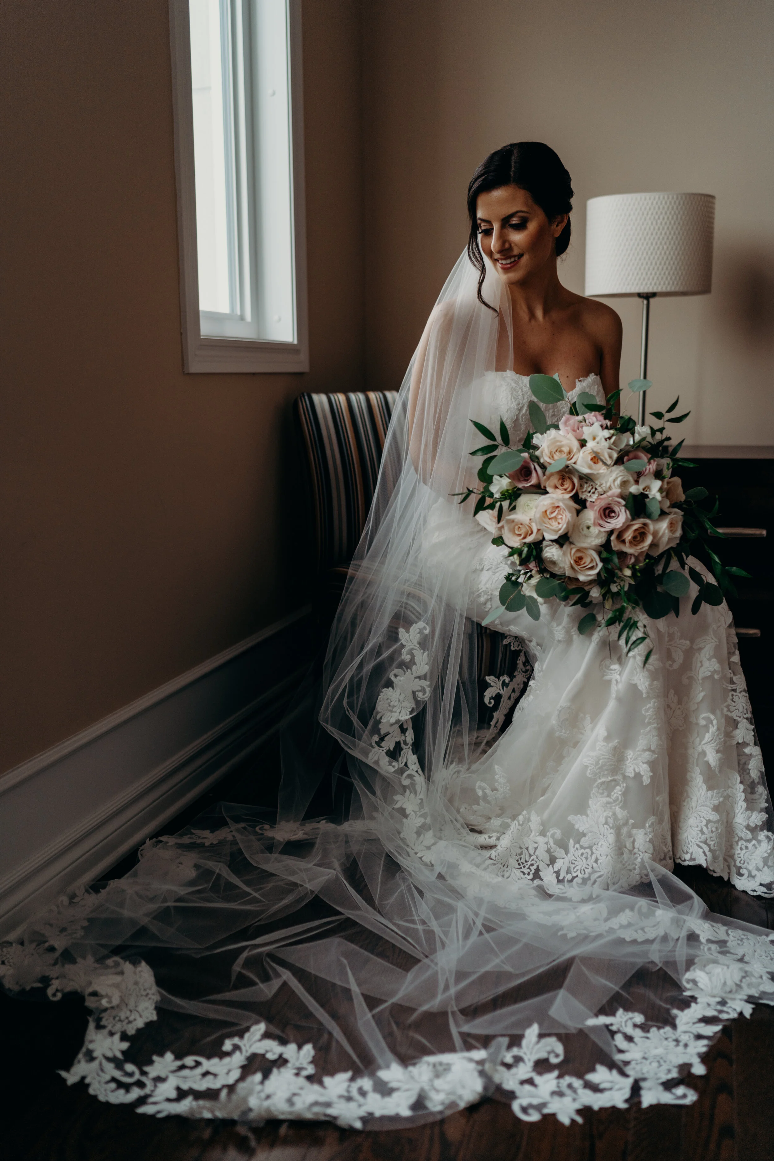 We chose this photo of Ruba for its simplicty and traditional look. The pose, the hair on the her right face, the bouquet, that face looking down, leading us to look at that flowing veil. Exquisite.