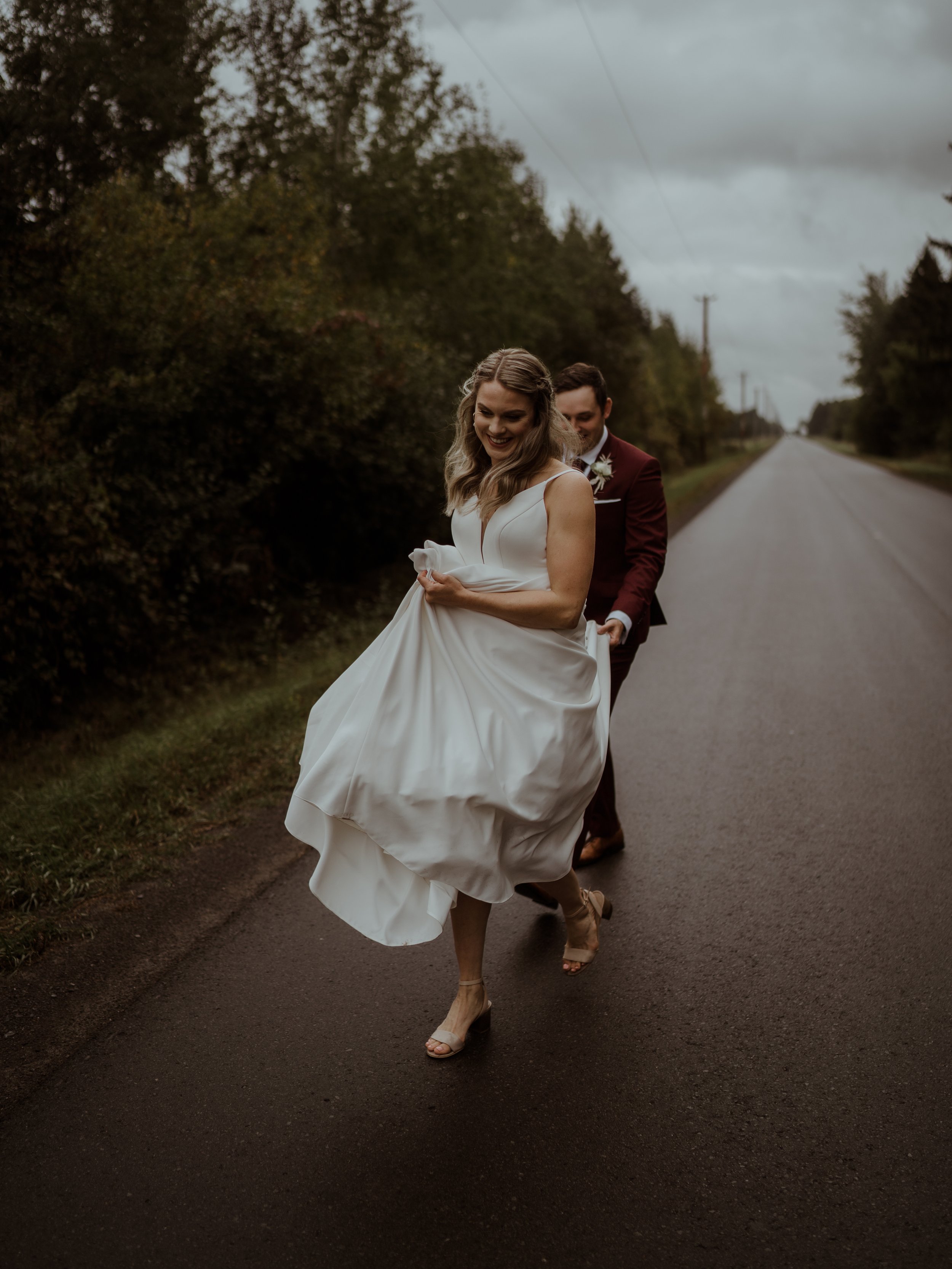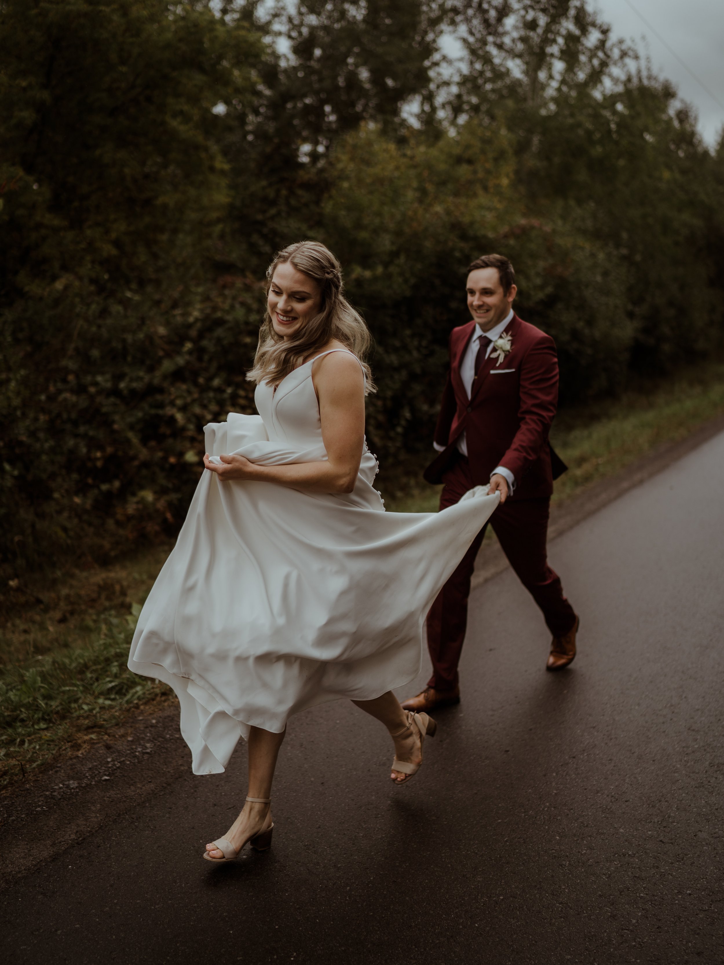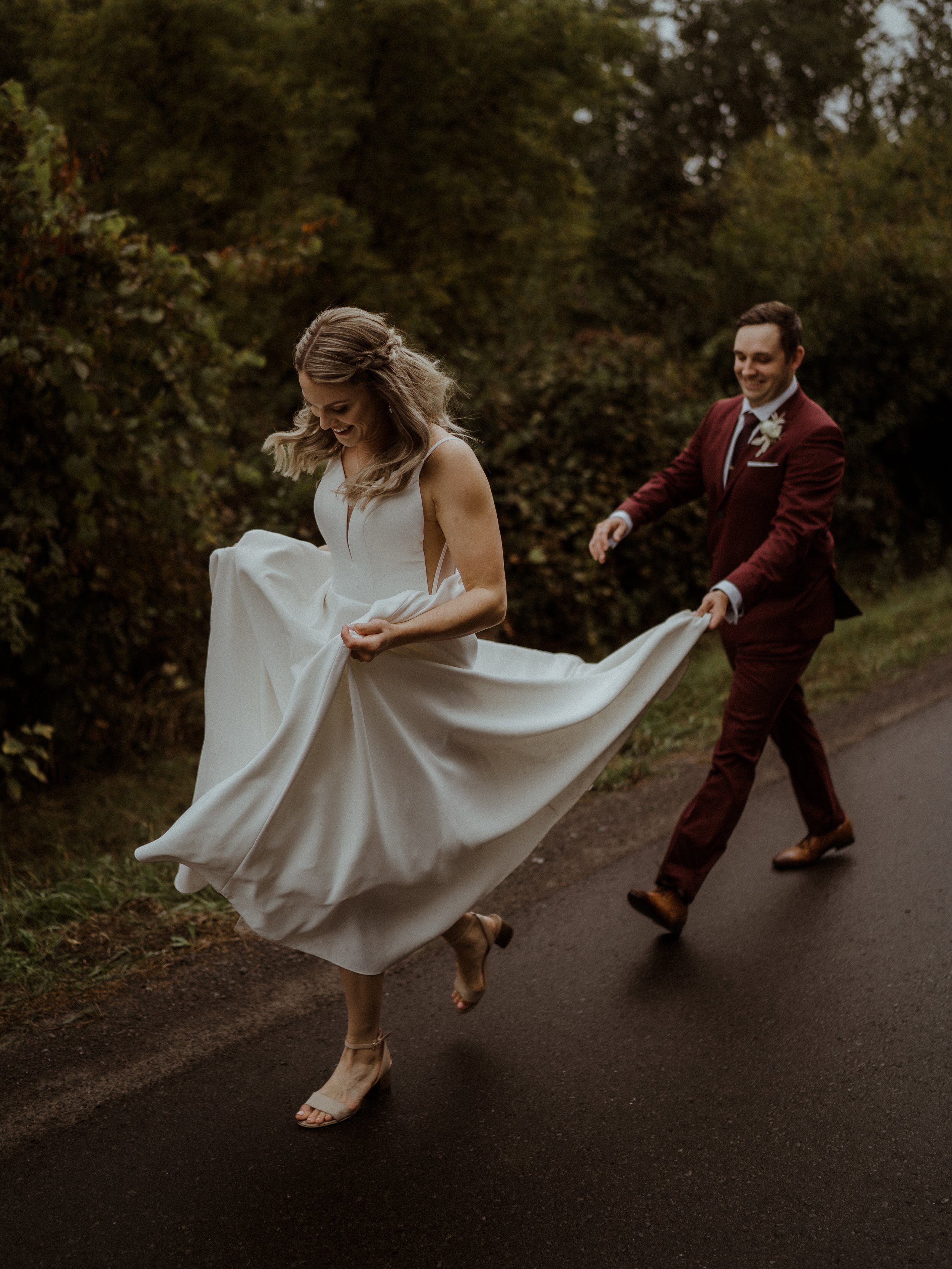 The things we do for photos. In this series, we see Josh and Erin running away from oncoming traffic on this very rainy day after taking some dancing photos in the middle of the road. Erin trying very hard not get her dress wet and dirty.