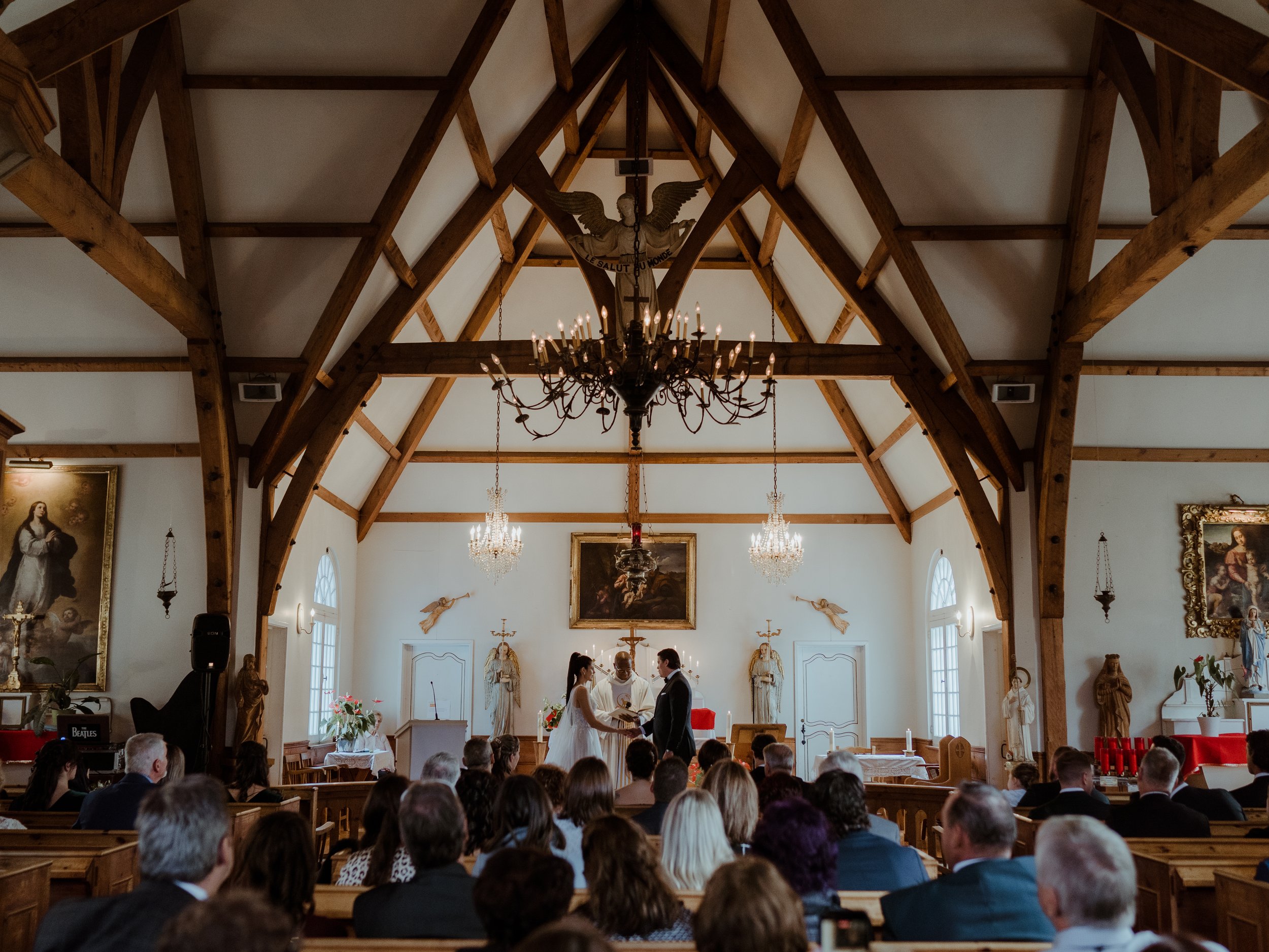 Tanya and Maxime's Mont Tremblant wedding in Chapelle Saint-Bernard is one of our favourite ceremony shots this year. Not only is this chapel gorgeous, not have middle-aisle frames Tanya and Max so well. We are crazy for symmetrical compositions, as you all know!