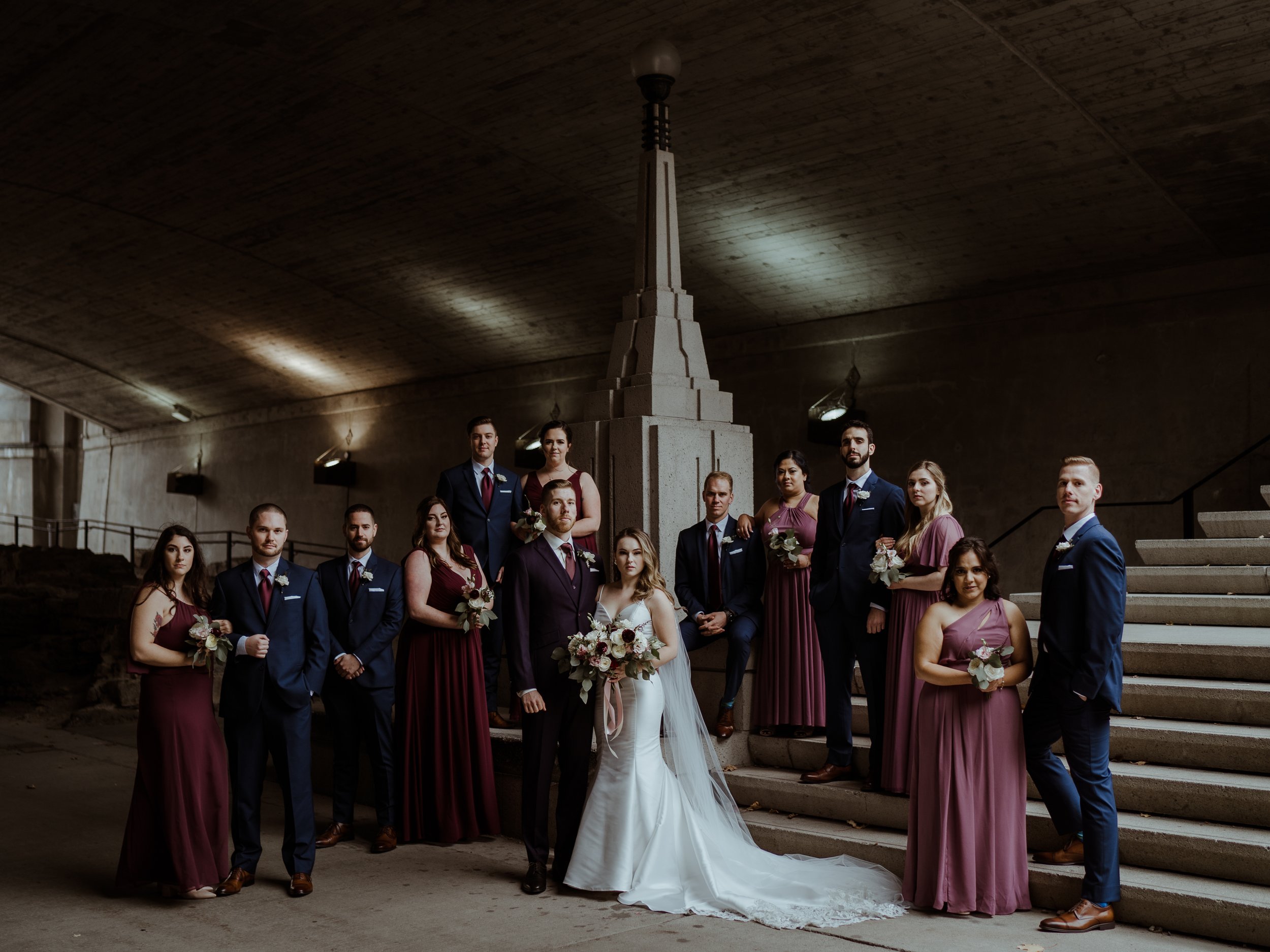 The moment we took this photo of Eugenie and Michael's wedding party, we knew it would easily be one of our favourites. This was one of the wettest and coldest days of October. Having such a big wedding party be, so game to do any photos is a wedding photographer's dream!