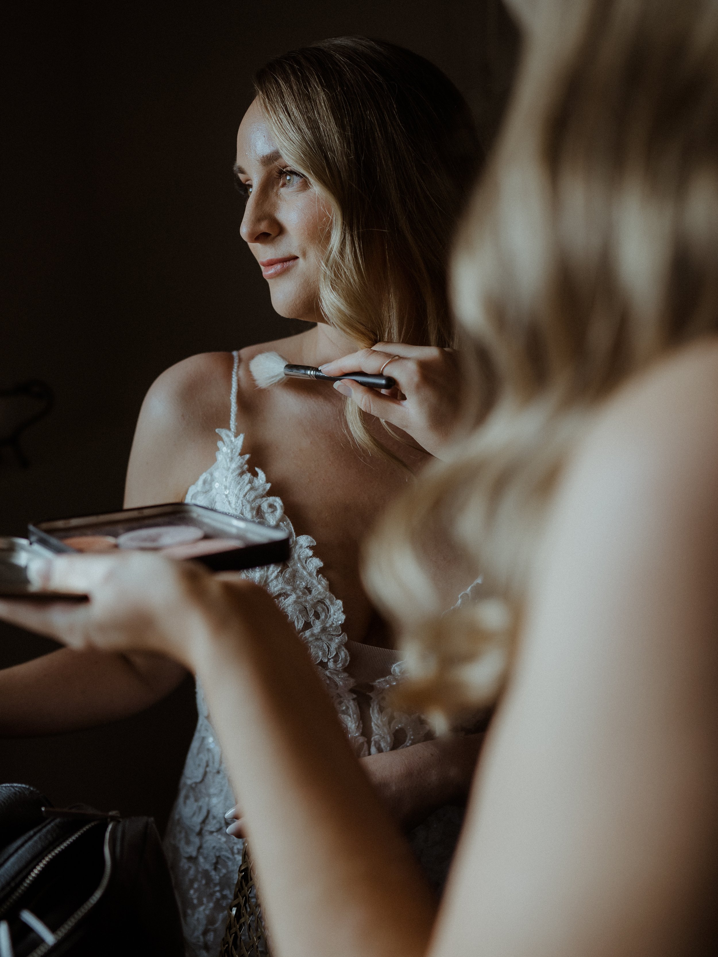 For getting ready photos, we are including two of Melissa getting her touch ups done and peeking out just before she walks down the aisle in Adelina!