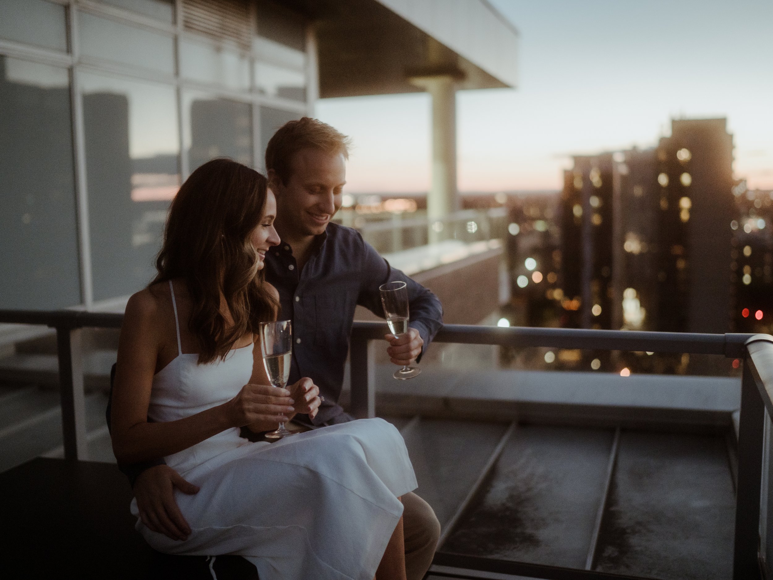 Let's start off with Sarah and Lorinc's engagement session and this particular photo of them just hanging out on their rooftop sipping some champagne on one of the best blue-hour moments, making the Ottawa skyline look like a dream.