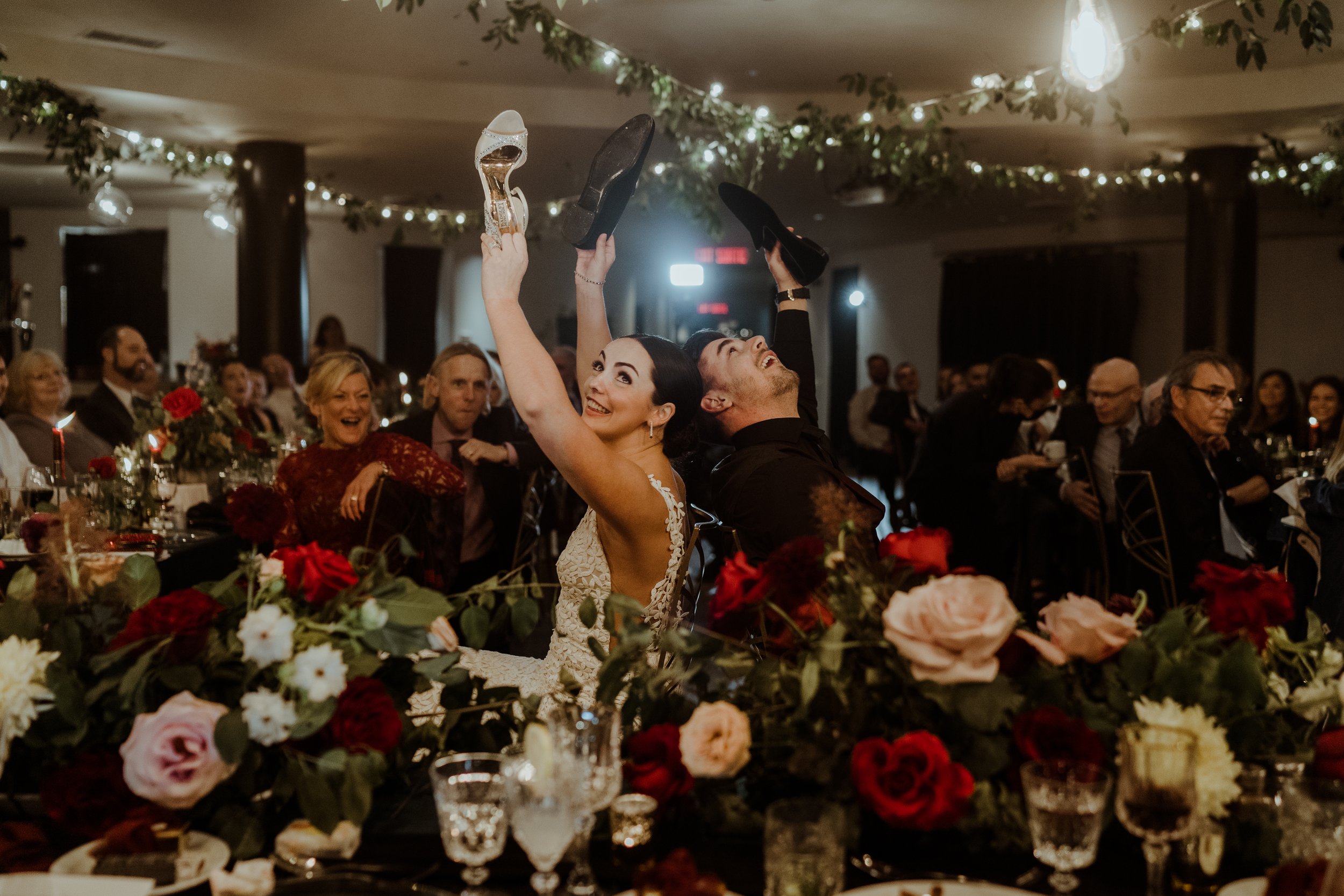 One of our favourite wedding shoe-game photos ever. Samantha and Jacob having a blast framed by Frid's gorgeous floral arrangements.